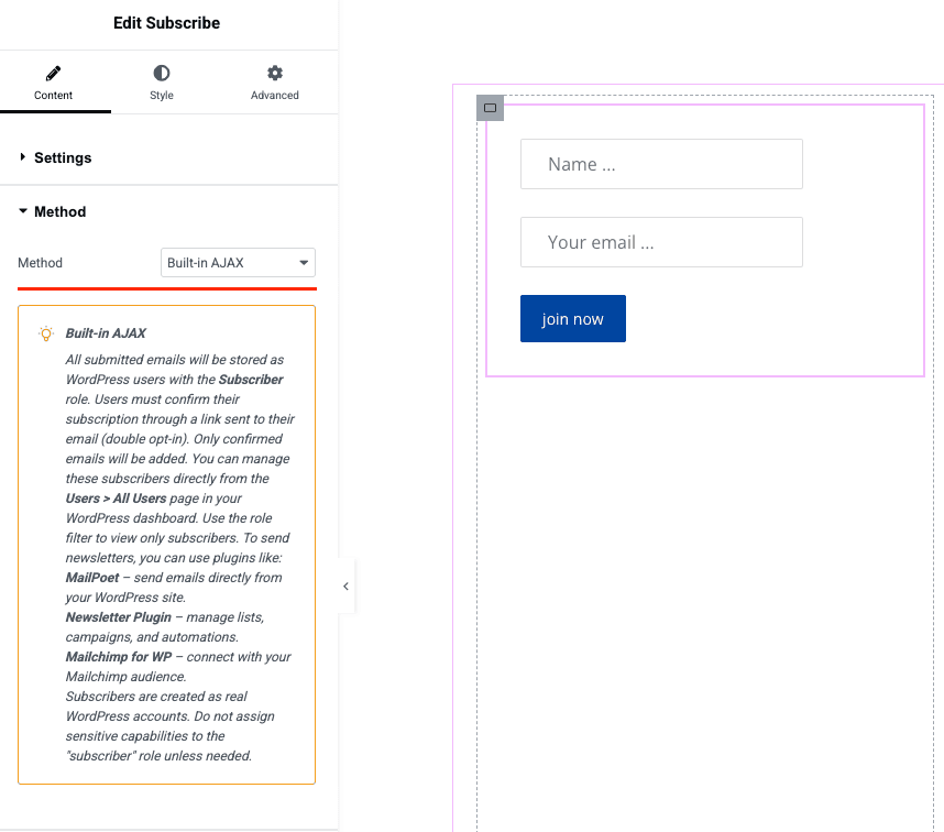 - Added name field & AJAX to subscribe element for collecting emails as WP Users [ Screenshot ]