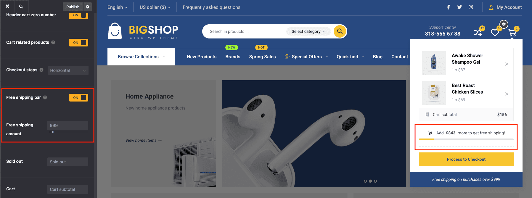 - Added WooCommerce free shipping progress bar with specific amount [ Screenshot ]