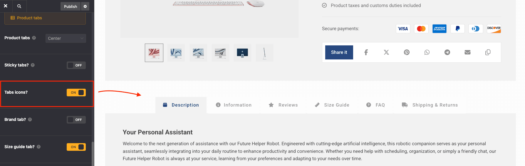 - Added WooCommerce icons support for single product page tabs [ Screenshot ]