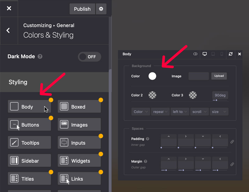 - Individual Page Background – Edit your page in backend and from page settings you can find Body StyleKit and change background color.