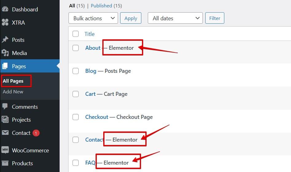 All pages created by Elementor have an “Edit with Elementor” link on all pages.