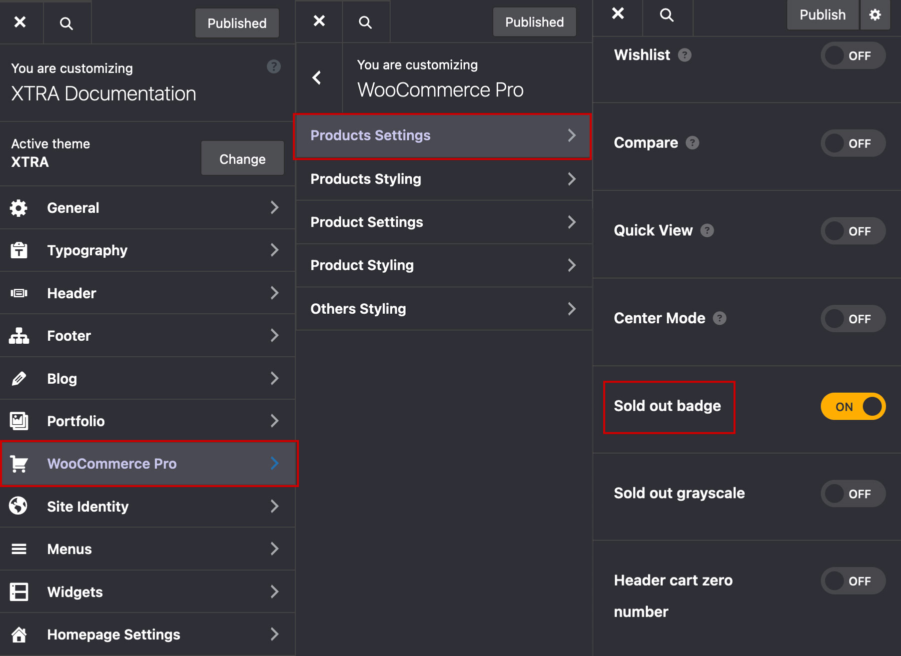 Under Theme Options > WooCommerce Pro > Products Settings you can turn on Sold out badge feature. We use this option to display out of stock products.