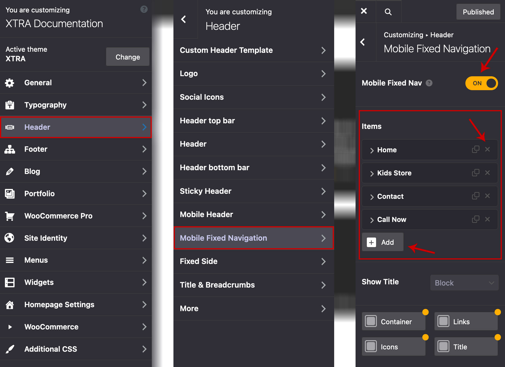 You can edit the Mobile Fixed Navigation in the WordPress Xtra form from the following path: