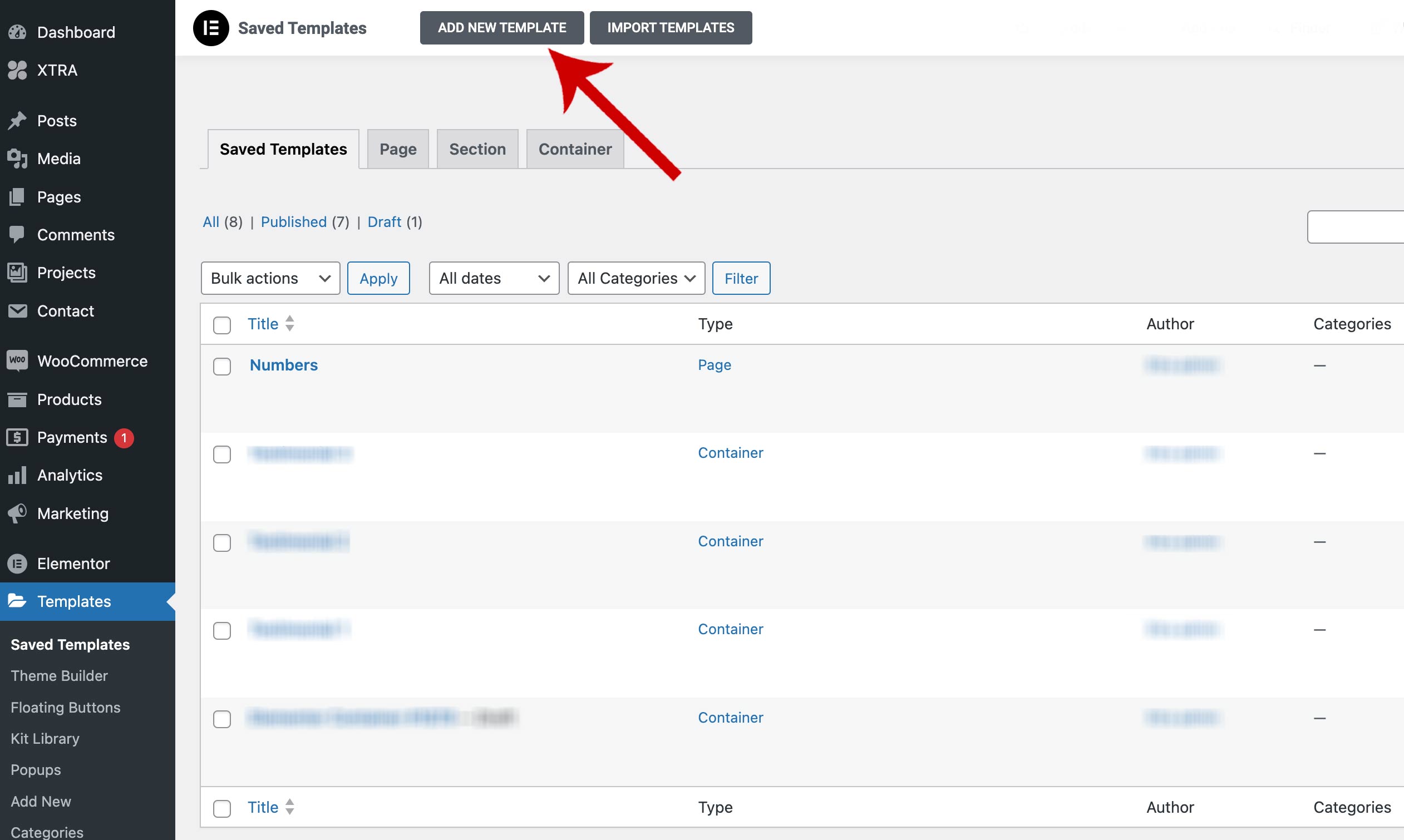 - click on the arrow next to the “Update” button at the bottom of the Elementor panel and Select “Save as Template” from the dropdown menu.