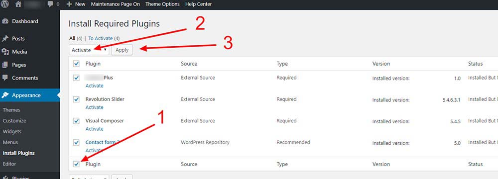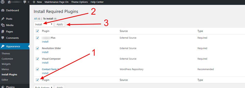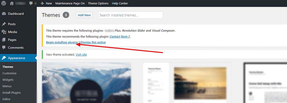 After activating the XTRA theme, you will see the message that tells you to install required plugins, click on Begin Installing Plugins or if you can’t see that message, Go to Appearance > Install plugins and start installing all the plugins